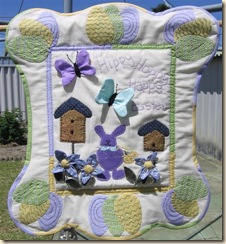 This one the Editor of Handmade asked the ladies on the forum to enter the challenge of using items around the house that we would be throwing out and so I got some shirts from the local Op Shop and cut them up and then I had some old corks which I cut in half and made this cork pin up board. It was good fun.